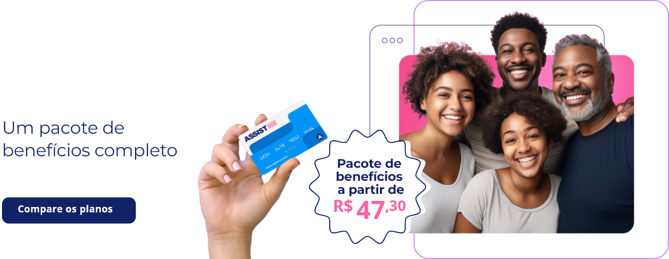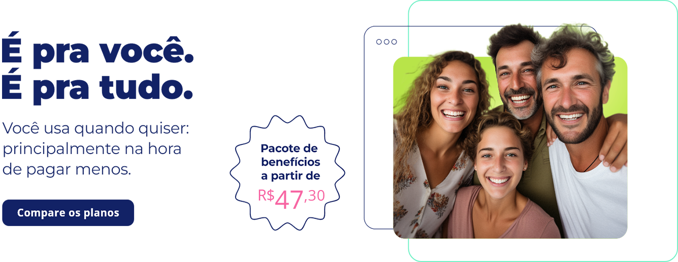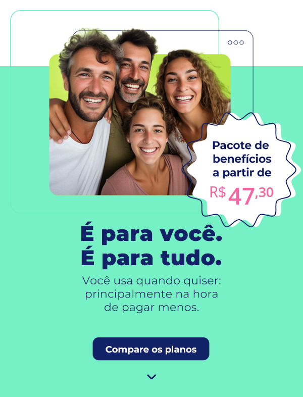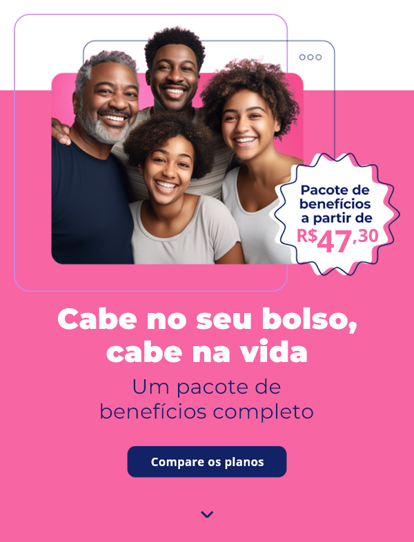 É um pacote que reúne mais de 10 benefícios para você e sua família: Plano odontológico, seguro invalidez por acidente, assistência pet, desconto em farmácias, telemedicina 24 horas em urgências.